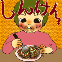 我々の真似をして、必死でへらで食べていました。お皿じゃ難しいって何度も言ったのですが、意地で全部食べてました(笑)
