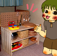 主婦雑誌の「100円ショップ商品で作るインテリア」系の記事が結構好きで(笑)、さらに「カラーボックスで作るおもちゃのキッチン」などの記事が頭の隅に残っていたのです。