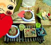 その辺にあった器などを寄せ集めたらしいままごとセットは、市販のままごとセットにはない味や趣が感じられてほっこりしてしまいました(^^)